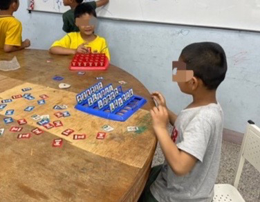 寫完學校作業後,老師帶學童們體驗不同的遊戲,考驗記憶與推理的桌遊,還有兩兩合作把自製紙板送至終點