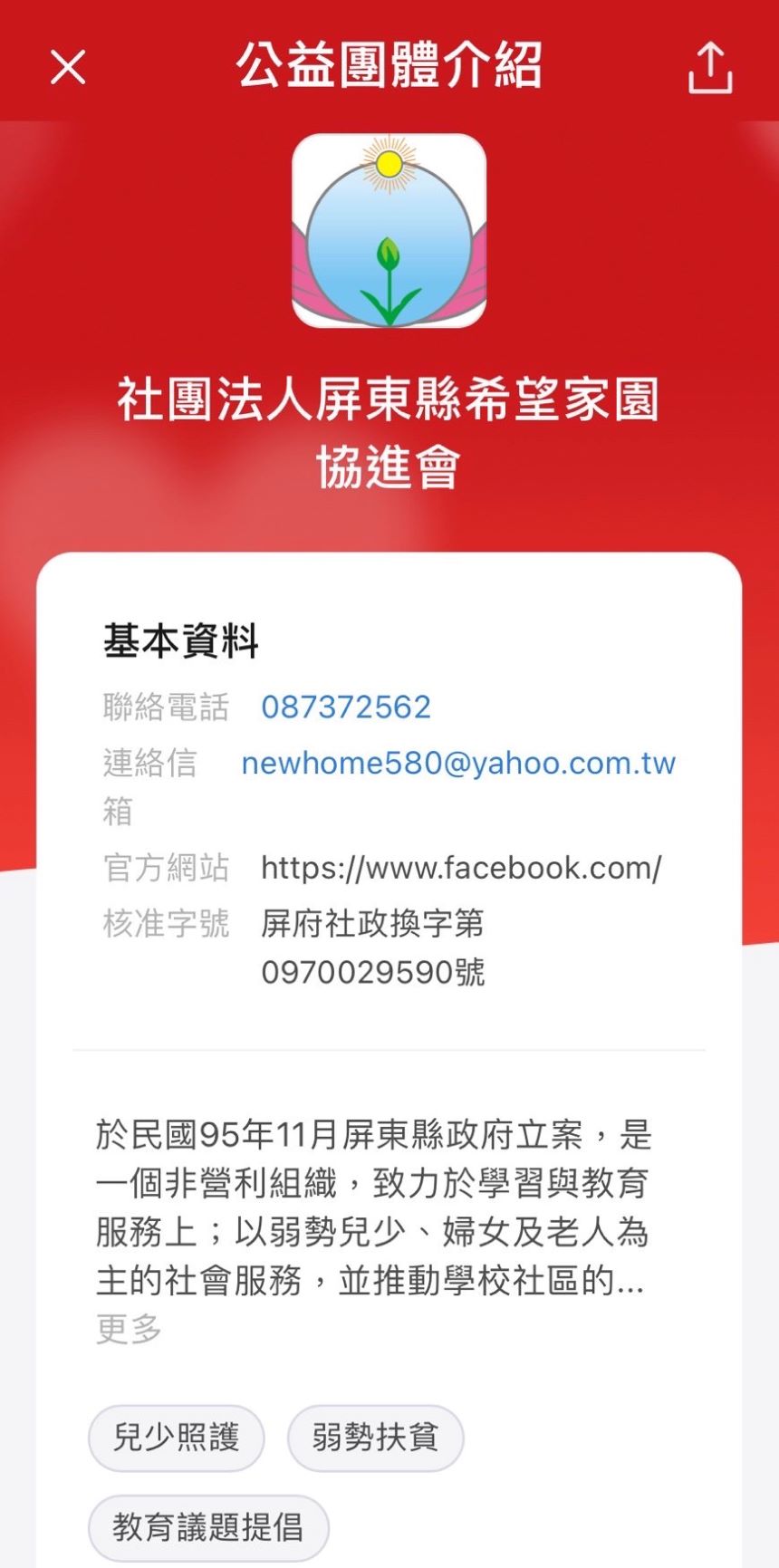 🔎搜尋「希望家園」找到我們的Logo跟機關名稱就可以了喔(如圖)