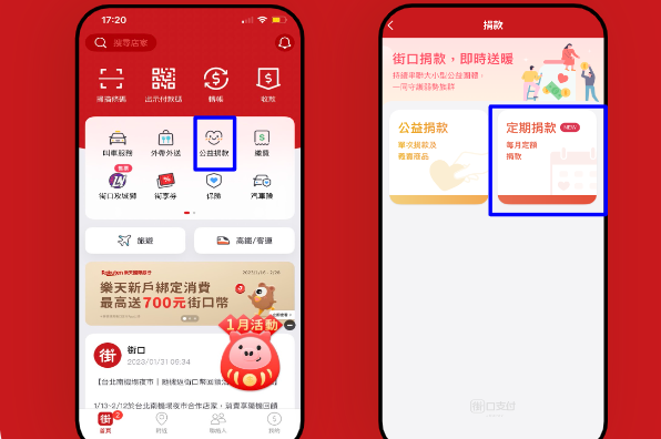 須下載街口支付APP,在APP首頁>「公益捐款」點擊進入後,會分為「公益捐款」及「定期捐款」>點選「定期捐款」