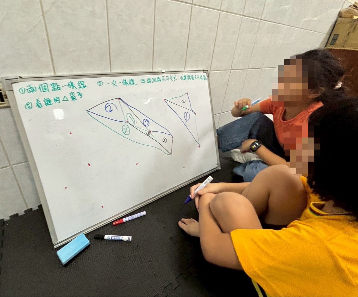 學童們很專注在思考,哪邊還能再畫出一個三角形👀