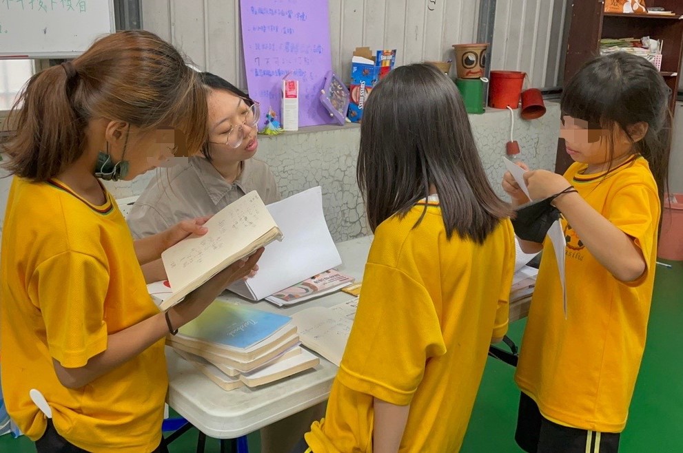 大家圍在課輔老師旁邊,拿考卷給她看📝