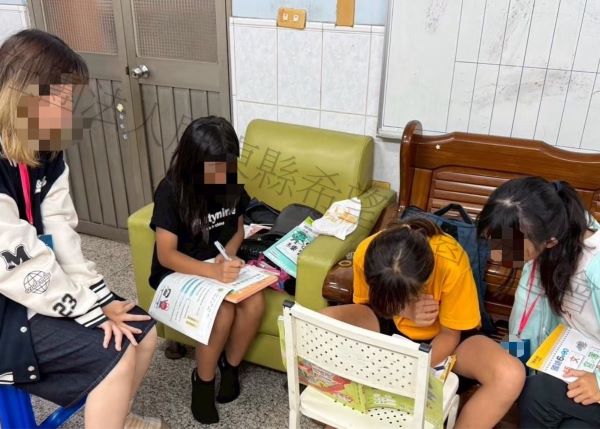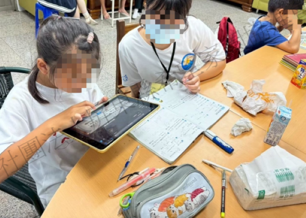 課輔老師與志工協助學童,用平板進行線上作業的繳交